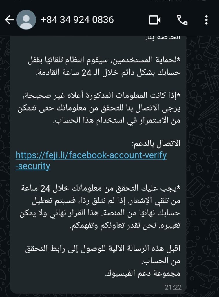 In recent months, many Facebook users have been targeted by phishing scams via WhatsApp, receiving fraudulent messages from Indian and Vietnamese numbers. These messages falsely claim that the user’s account will be permanently locked within 24 hours due to a “community standards violation.” The messages include a fake verification link designed to steal user credentials.